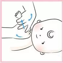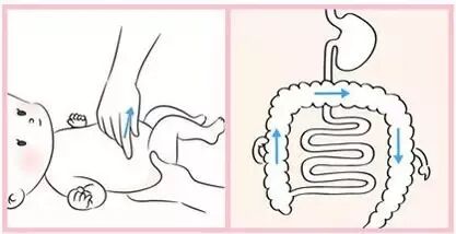 5)此外,也可以時常照著圖的箭頭方向,好像手指走路,依序替寶寶按壓腸子,路徑很像一個大的“ㄇ”字,有助寶寶的腸胃蠕動。