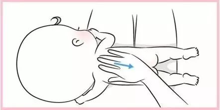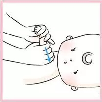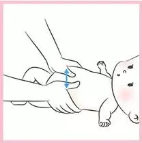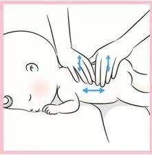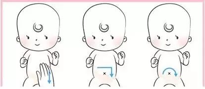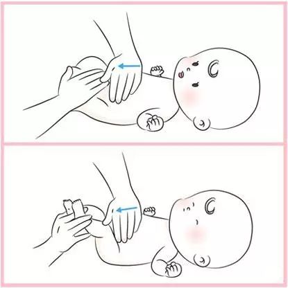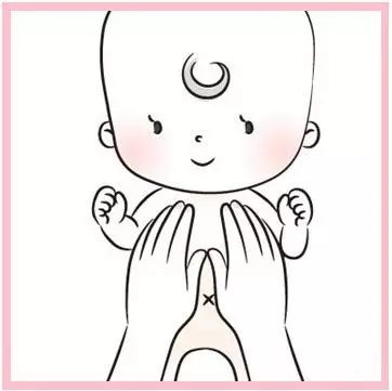 2)雙手拇指放在肚臍兩側,由中心向外平行分推開來,力道要慢、緩、柔、圓,以緩解寶寶的脹氣和便秘問題。