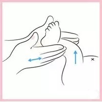 6)雙手握住寶寶的腳掌,將雙手的拇指放在寶寶腳趾下方的中心位置,慢慢按壓至腳跟,可重複數次。